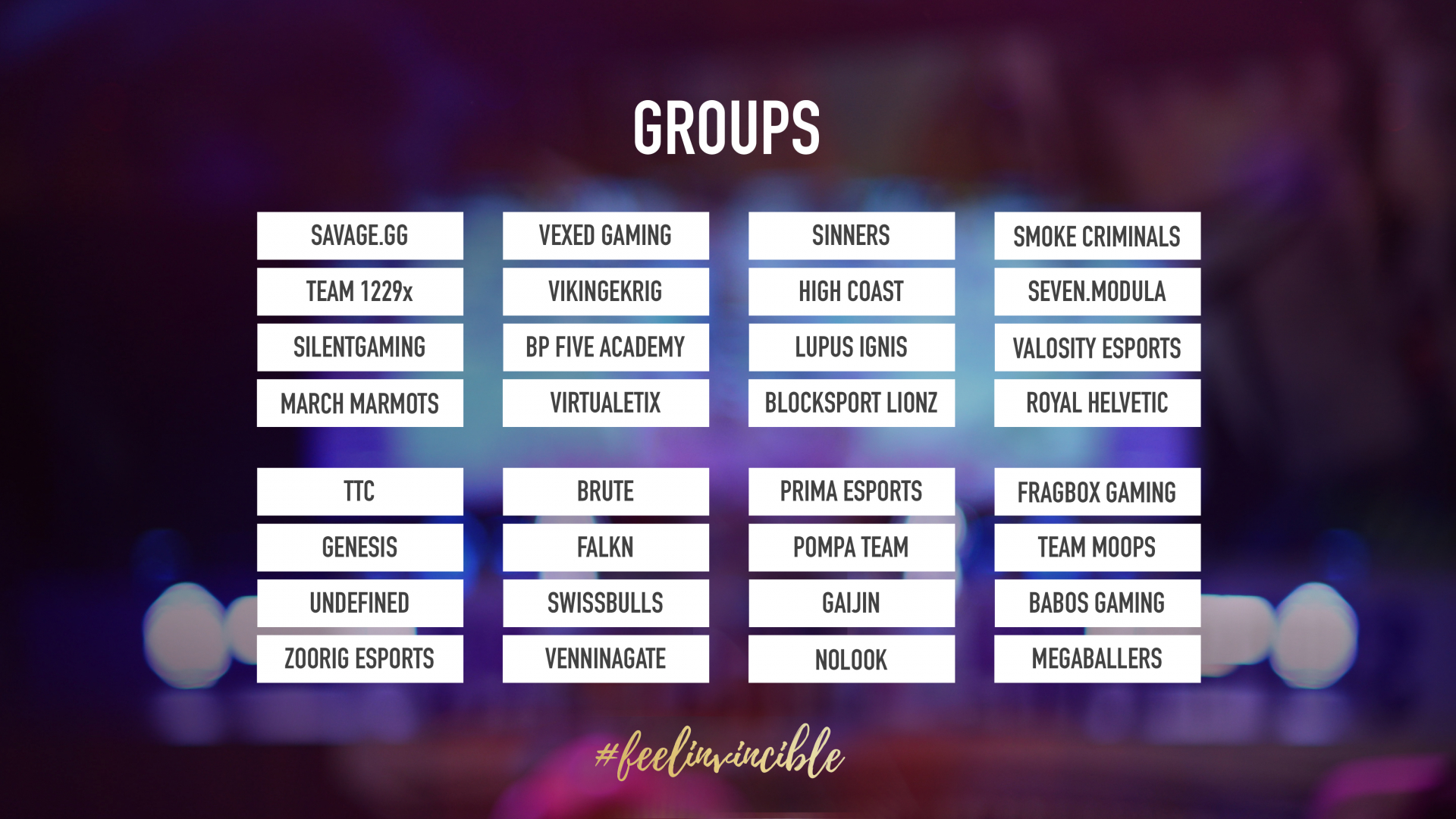 Grupp A savage.gg quix, b0denmaster, pyth, Peppzor, tba Team 1229x shaker, tofi, Peeta, tomsku, fiffikus SILENTGAMING reiSh, dance, wizzek, bernini, muSh March Marmots tba, tba, tba, tba, tba