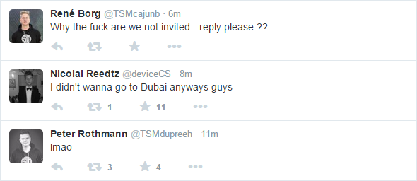 (Tråden/info tagen från Reddit(https://www.reddit.com/r/GlobalOffensive/comments/3fmd9w/tsm_not_invited_to_dubai_tournament/) , tycker detta förtjänar så mycket uppmärksamhet som möjligt, inte loggat in på fragbite på ett lååångt tag.)